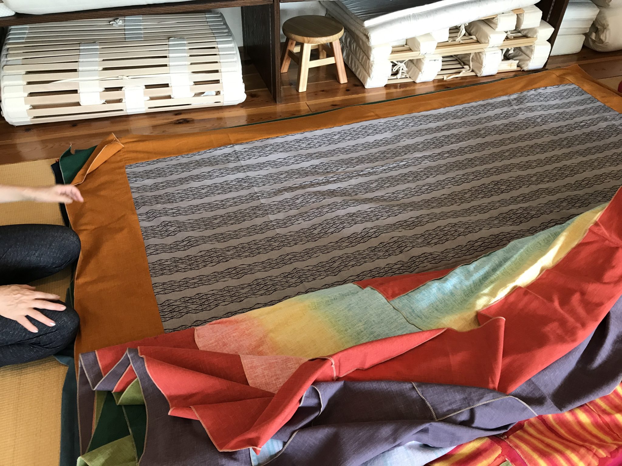 プリントの生地の物だと中々面白くないですからね。で、毎年夏に来るサンタクロースの宮崎さん手染めの生地で作られた、おこたのおふとんです!